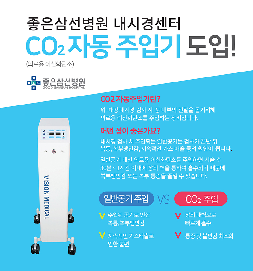 내시경 검사 시 주입되는 일반공기는 검사가 끝난 뒤 복통, 복부팽만감, 지속적인 가스 배출 등이 원인이 됩니다. 일반공기 대신 의료용 이산화탄소를 주입하면 시술 후30분~1시간 이내에 장의 벽을 통하여 흡수되기 때문에 복부팽만감 또는 복부통증을 줄일 수 있습니다.