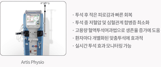신형 투석기계 Artis Physio는 투석 중 저혈압 발생빈도를 줄여 심혈관계에 미치는 스트레스를 감소시킵니다. 또한 새로 도입된 고효율 필터(Theranova)는 높아진 투과성으로 중분자 요독물질을 효과적으로 제거하여 지속적인 사용 시 심혈관계, 근골격계 질환이 호전됩니다. 기존 HDF 필터와 같거나 그 이상의 효과를 보여주는 필터입니다.