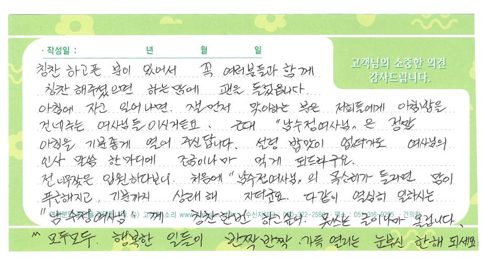 좋은삼선병원 영양팀 남수정님께 보내온 감사편지를 소개해드립니다.