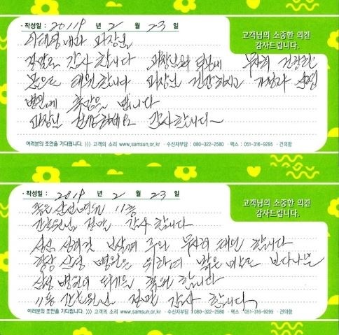 정 ○ ○ 님께서 보내주신 감사의 편지 2장입니다.